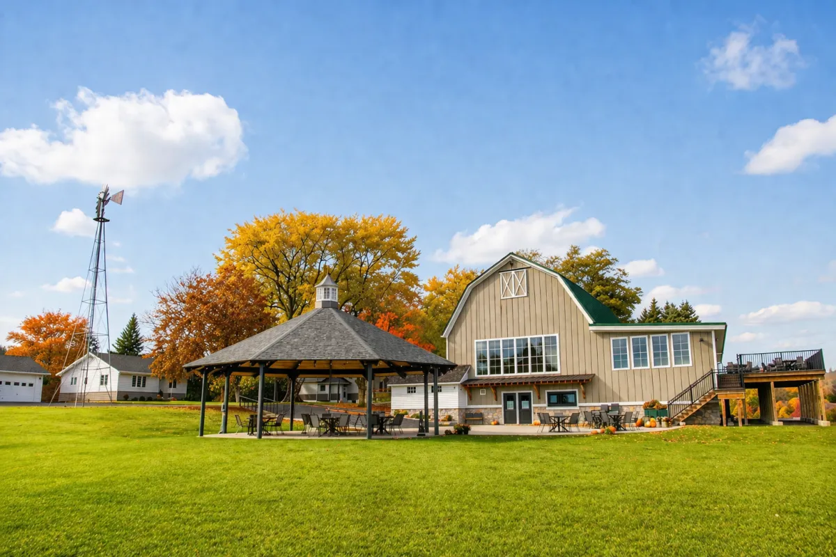 Access to various areas including the gazebo, patio, deck, and both the upper and lower levels of the barn, each equipped with a bar area (Note: Bar packages are available but sold separately).